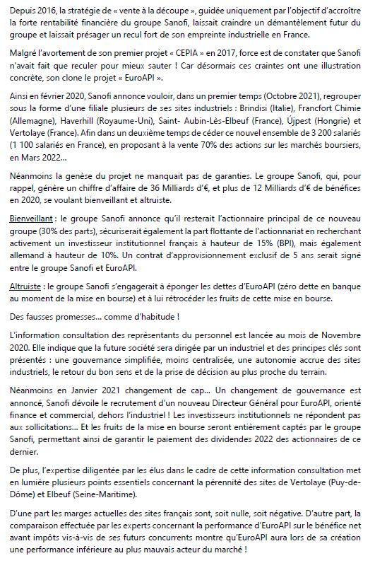Nous avons rencontré des interlocuteurs documentés sur le sujet (il faut dire que le ministère avait été interpellé la semaine précédente à l’assemblée et au sénat – ). Résultat : nous devons envoyer une présentation reprenant les éléments discutés afin que le ministère puisse retourner interpeller Sanofi (dans les éléments, rien de nouveau : rétropédalage sur les fruits de la mise en bourse, vétusté, dette d’obsolescence de Sanofi envers les sites, incapacité de Vertolaye à générer des marges positives depuis des années, risques pour les sites français VS autres sites d’EuroAPI vu leur marge brute nulle voire négative, alerte sur la présentation macro d’EuroAPI faite par Sanofi qui occulte la vulnérabilité des sites français, alerte sur la COM de Sanofi qui concerne des investissements soit liés à la remédiation environnementale soit passés (2019 & 2020) => nécessité de s’assurer de la qualité des futurs investisseurs, et d’une contribution de Sanofi en termes de cash afin qu’EuroAPI soit sure d’être en mesure de payer les investissements de remise à niveau nécessaires – conseil donné de demander à Sanofi de céder des parts d’EuroAPI à la BPI qui elle, pourrait rétrocéder aux sites français, les besoins évalués en investissement 😉).
