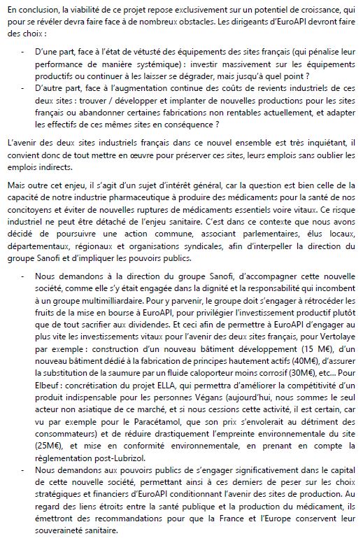 Les propos récents de M. Castex annonçant « un plan massif de réinvestissement de Sanofi en France » nous amènent à nous demander si nous n’allons pas être les laissés-pour-compte ! Nous comptons sur votre appui pour que cet investissement se fasse aussi et surtout sur les sites Euroapi. Nous ne voulons pas que la situation des sites Euroapi en France fasse l’objet d’une instrumentalisation politique, des élus LR nous ont contacté pour organiser une rencontre (pour preuve voir fin du courrier en PJ). Nous sommes satisfaits du travail réalisé tous ensemble jusqu’à présent, et nous vous remercions encore une fois d’avoir pris le temps de nous recevoir, c’est pourquoi, afin d’éviter toute récupération politique, il est impératif que les sites Euroapi ne soient pas les grands oubliés de cette annonce gouvernementale. Une rétrocession de 15% des produits de la future mise en bourse (somme insignifiante au regard des résultats annoncés par SANOFI la semaine dernière…) comblerait nos attentes et permettrait à tous les salariés de croire en l’avenir de cette nouvelle société avec plus de confiance. Autrement dit, cela stopperait net toute forme de protestation à l’égard du projet.