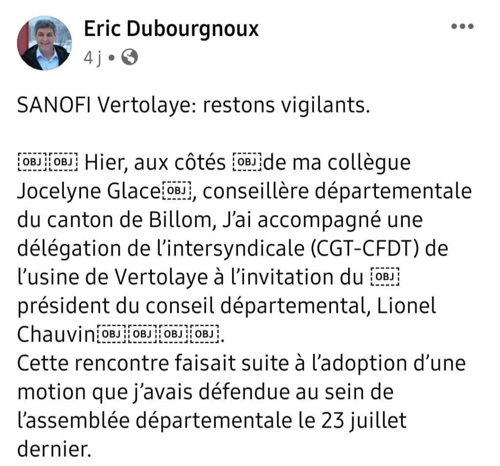 ==> Les élus, alertés, annoncent vouloir prendre contact avec la direction des affaires industrielles de Sanofi et la Direction du site de Vertolaye. Une synthèse des échanges sera réalisée pour informer le président L. Wauquiez.