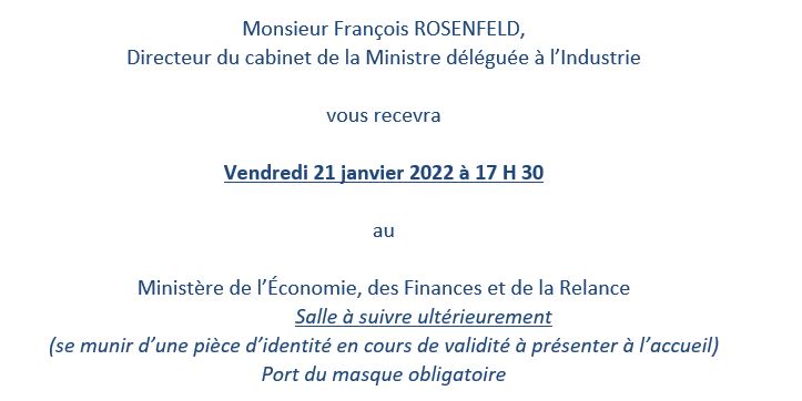 21 janvier 2022, une délégation est de nouveau reçue, mais cette fois-ci par le Directeur de Cabinet de la ministre déléguée à l’industrie Agnès PANNIER-RUNACHER : M. François ROSENFELD.