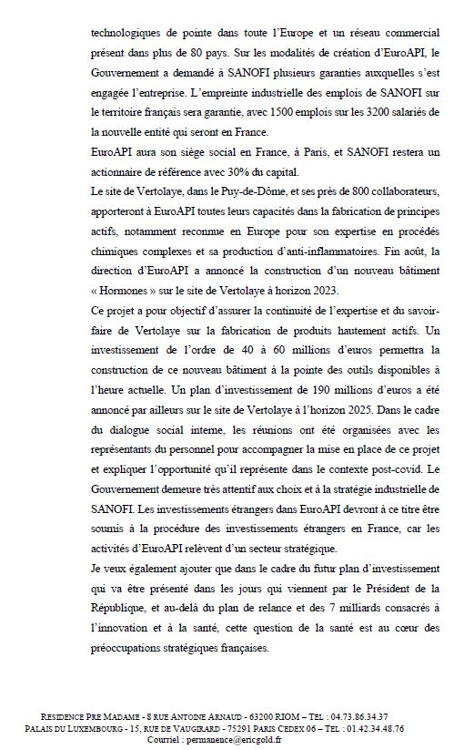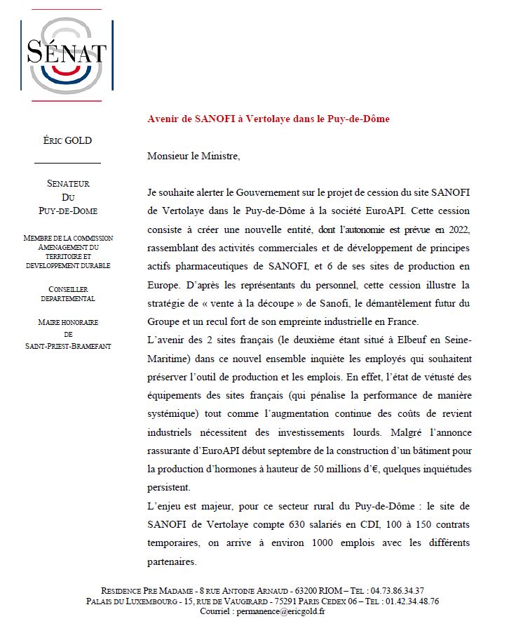 Mon collègue André Chassaigne et moi-même voudrions vous entendre sur l’intention du groupe Sanofi de déléguer dans quelques jours les sites de production de principes actifs pharmaceutiques (API) à la filiale EUROAPI. Six usines européennes de Sanofi sont concernées, dont les usines françaises de Saint-Aubin-lès-Elbeuf et Vertolaye qui emploient près de 1 200 salariés. Ceux-ci redoutent que la sortie du groupe ne soit le prélude à une liquidation, à cause de multiples incertitudes. Les usines sont vieillissantes ; des investissements lourds sont nécessaires pour remettre à niveau l’outil de production. EUROAPI devra d’ailleurs financer sur ses seuls fonds plusieurs projets majeurs d’investissement, engagés par Sanofi. En effet, cette dernière se déleste d’usines qui produisent des molécules d’intérêt thérapeutique avéré, dont un antibiotique essentiel qui dégage de faibles marges. Tout cela a pour objectif de financer des acquisitions dans le domaine de la biotech. Sanofi réduira à 30 % sa présence au capital d’EUROAPI. Or aucune information n’a filtré concernant l’identité des investisseurs susceptibles d’y entrer. Une prise de participation majoritaire de fonds spéculatifs, guidés par la recherche de hauts rendements, serait susceptible de compromettre les productions et notre indépendance nationale.