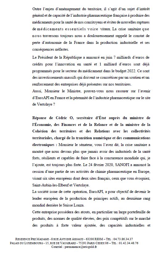 Comme prévu, le sénateur Eric GOLD a posé une Question Ouverte Sans Débat au sénat le 28/09/2021. La voici, en vidéo http://videos.senat.fr/video.2506413_6152b8612cc25.seance-publique-du-28-septembre-2021-matin?timecode=7140000